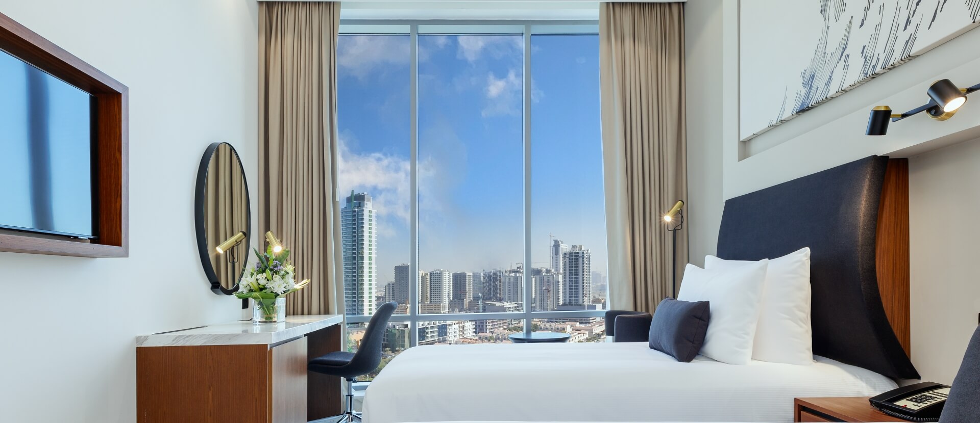 Relax in style with a spacious king-size bed, plus the choice of a bathtub or shower. Enjoy complimentary Wi-Fi, a 49-inch smart TV, minibar, tea and coffee amenities, and a safe—ideal for both business stays and unwinding in comfort. Plus, with rooms on higher floors, you’ll enjoy stunning views to complement your stay.